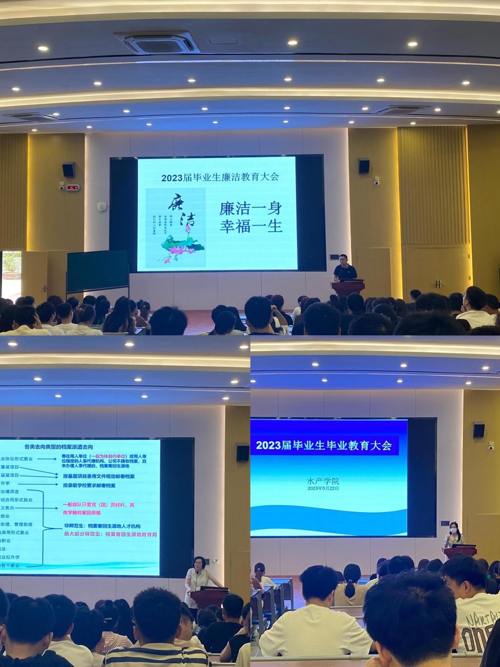 近日,水产学院召开毕业生教育大会,2023届研究生毕业生、本科毕业生参加。院党委副书记黄庆胜、院团委副书记和辅导员分别就廉洁、法制、诚信、爱校荣校、就业等主题开展教育引导。