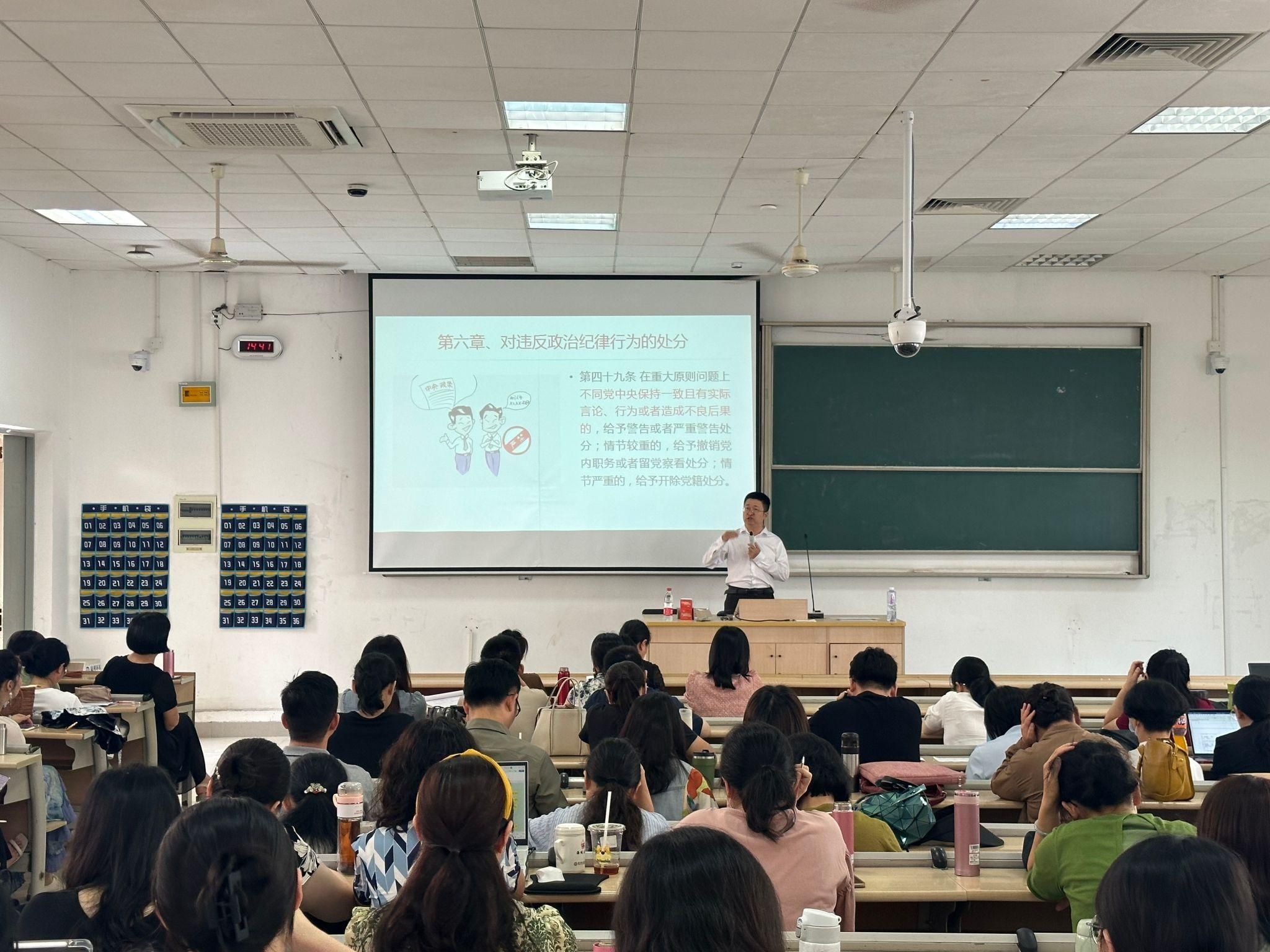 董立功介绍中国共产党的现状、习近平总书记关于全面加强党的纪律建设有关论述,带领大家概览了党的纪律建设百年历程、《中国共产党纪律处分条例》历次修订情况,讲解最新《条例》的修订部分。他结合陈嘉庚先生的廉洁思想和廉洁故事、2023年中央查处的突出案例、《新时代高校教师职业行为十项准则》等对违纪处分进行剖析,让大家在增长党纪知识的同时真切体验到党纪的震慑作用。