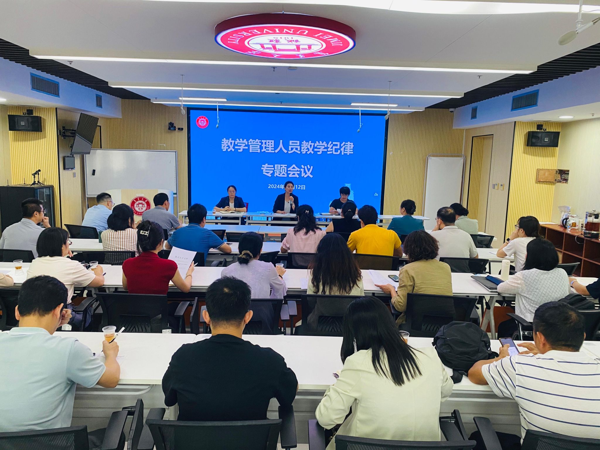 11月12日,教务处处长李雪主持召开教学管理人员教学纪律专题会。教务处副处长郑捷琴、占颖玉,各学院分管教学副院长、教学办主任等参加会议。
