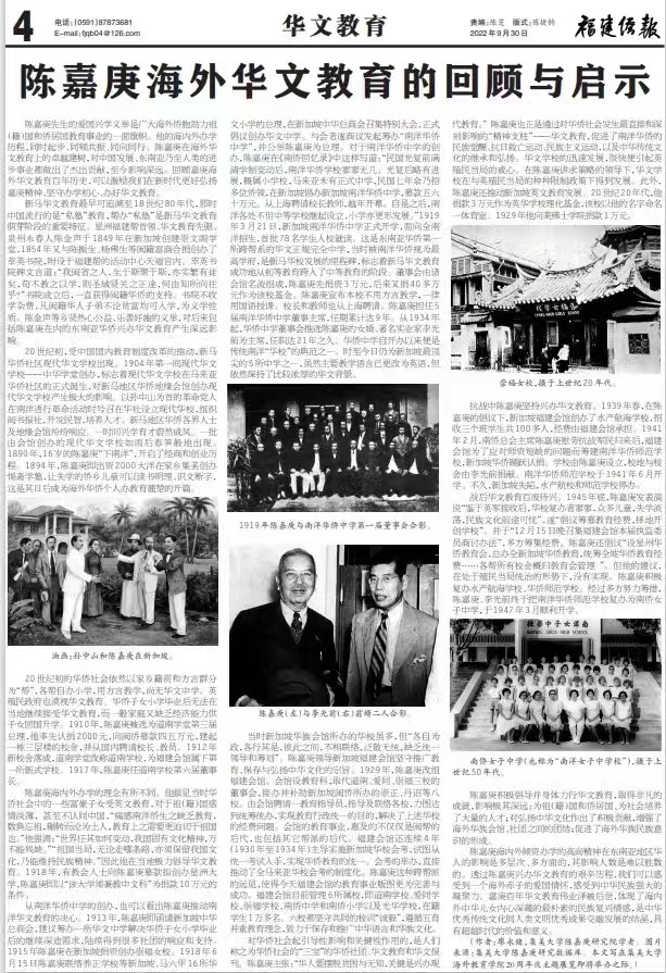 【福建侨报】陈嘉庚海外华文教育的回顾与启示